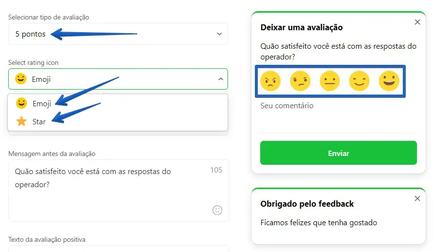 Selecionar tipo de avaliação: nesta opção você pode selecionar um número para o sistema de avaliação. Se você selecionar 2, os clientes verão apenas 2 opções (positiva, negativa). Se você selecionar de 3 a 5, seu cliente poderá avaliar de 1 a 5, usando emojis ou estrelas, como você verá mais adiante neste tutorial.