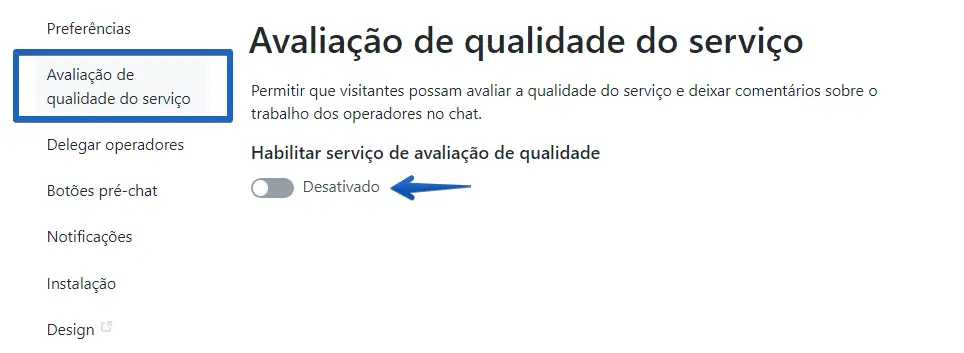 Neste menu, acesse "Avaliação da qualidade do serviço". Basta clicar no botão para habilitá-lo:
