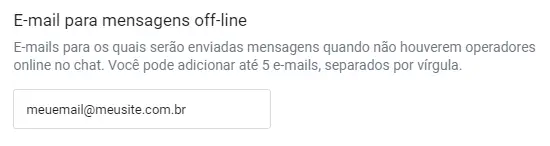 2.E-mail para mensagens offline - este endereço receberá as mensagens enviadas pelos visitantes do seu site quando os operadores não estiverem disponíveis para conversar, ou seja, quando estiverem offline ou em modo ausente.