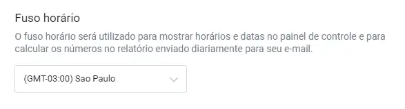 3.Fuso horário - o fuso horário será utilizado para mostrar horários e datas no painel de controle no aplicativo e para calcular os números no relatório diário enviado no seu e-mail