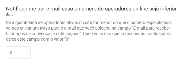 6.Se você é um administrador e deseja monitorar a presença de operadores online, você pode configurar para que notificações sejam enviadas para seu e-mail se o número de operadores online for menor do que um número definido por você.