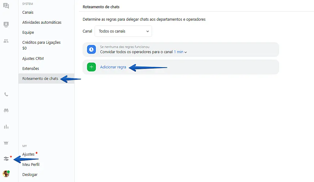 Entre em sua conta JivoChat -> clique em "Configurações" -> Roteamento de chats -> "Adicionar regra"