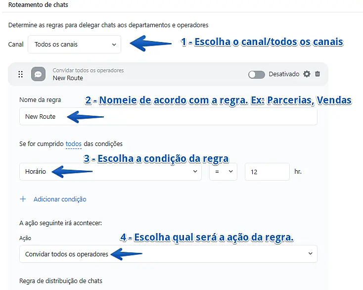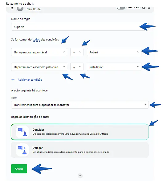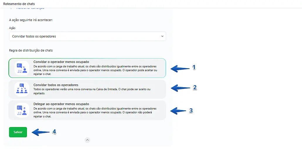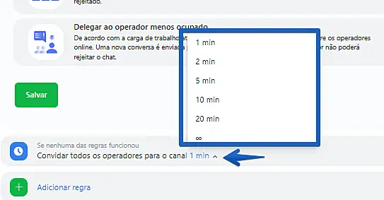 - Convidar todos os operadores: ativando essa regra, todos os operadores verão igualmente o chat na caixa de entrada, podendo aceitá-lo ou rejeitá-lo.