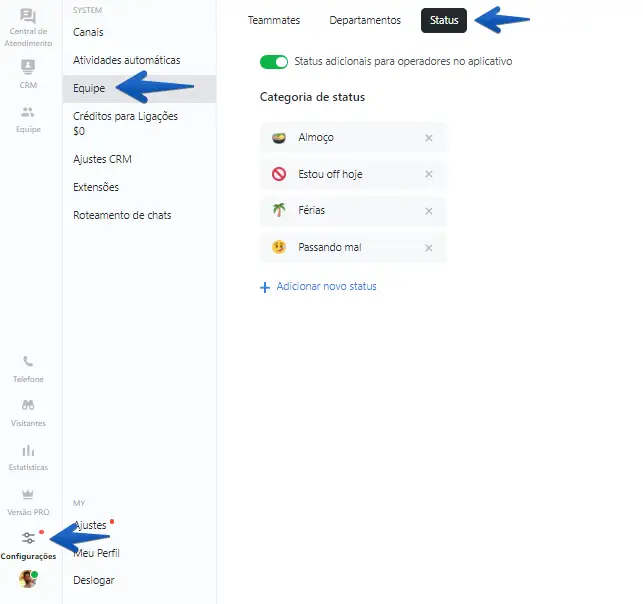 VIPPROAs configurações de status permitem que você gerencie o trabalho da equipe com mais eficiência, acompanhe a carga de trabalho dos operadores, distribua diálogos e transfira chats para operadores na ausência de um dos colegas, caso necessário. Maravilha, não é mesmo?