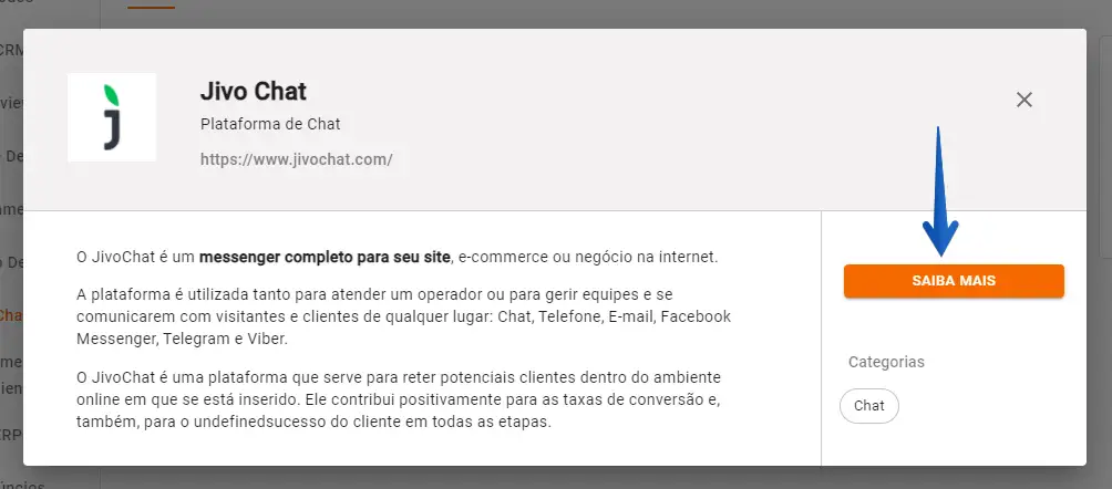Após clicar em JivoChat, abrirá um modal e você deve clicar em Saiba Mais. Ao clicar em Saiba Mais, você será redirecionado para uma landing page para criar a sua conta no JivoChat.