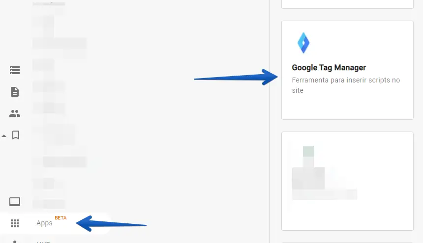 Antes de adicionar o script do JivoChat no Vnda, você precisa adicionar o Google Tag Manager em sua plataforma Vnda, indo em Apps > Todos > Google Tag Manager.