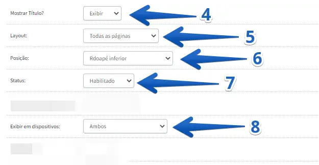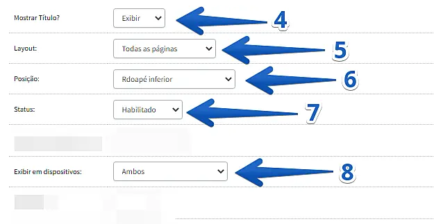 (4), oculte o título (5), marque para aparecer em todas as páginas (6), posicione no rodapé inferior (7), habilite o módulo em todos os dispositivos (8) e clique em Salvar (9) para finalizar.