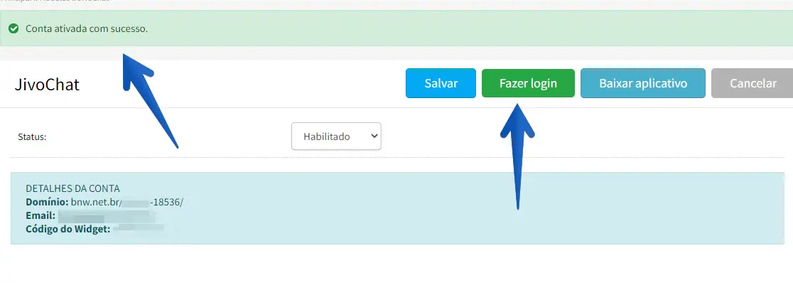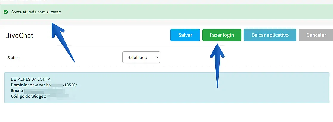 5. Ao inserir os dados, aparecerá a mensagem "Conta ativada com sucesso" -> Em seguida, clique em "Fazer Login" para logar em sua conta JivoChat