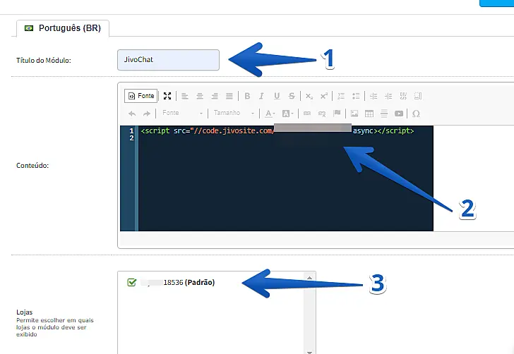 3. Insira um nome (1) para o módulo, clique em Fonte (2) e cole o código de instalação do JivoChat ali dentro, depois, selecione a loja na qual o módulo será usado (3)