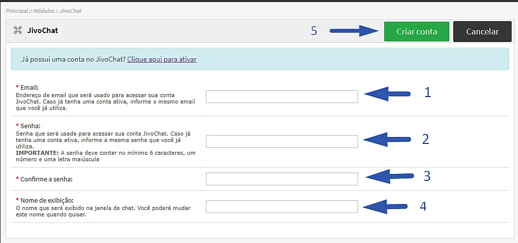 4. O contrário, insira os seus dados para criação de uma nova conta no JivoChat, são eles o e-mail (1) para logar no JivoChat como operador, no campos seguintes (2 e 3) você irá criar uma senha para acesso ao painel do JivoChat e a última opção é o nome que será exibido (4) na janela do chat.