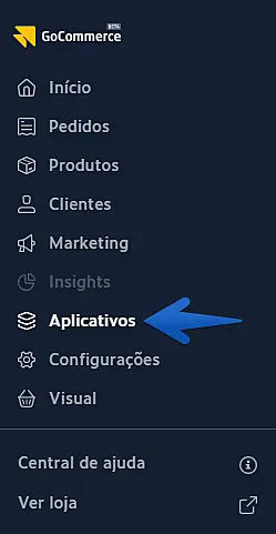 Primeiro, acesse o painel administrativo da GoCommerce e, no painel à esquerda, acesse o menu "Aplicativos".