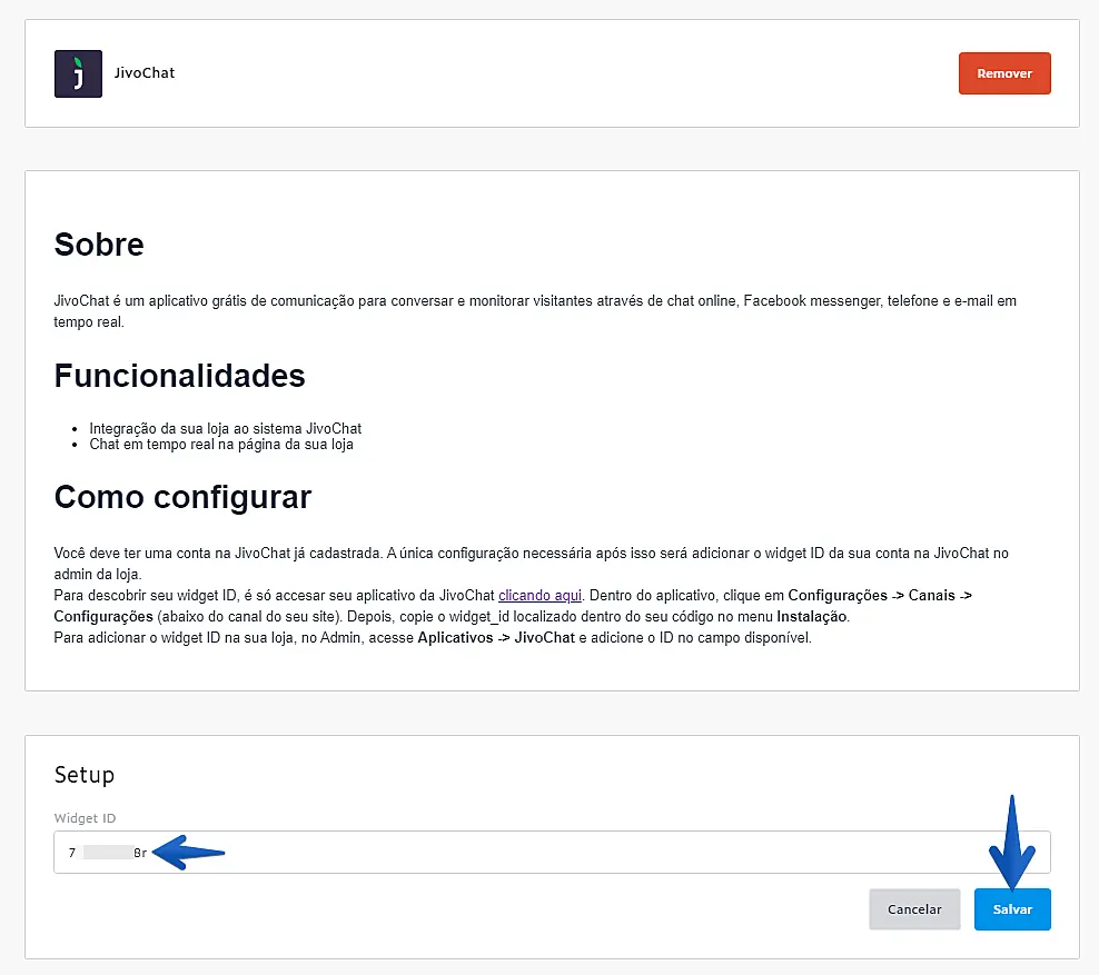 No próximo passo, você terá que inserir seu identificador do chat do JivoChat, chamado widget ID. O widget ID pode ser encontrado dentro do código de instalação do chat.