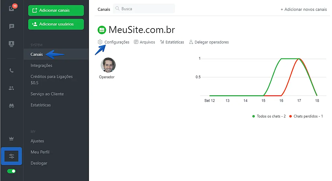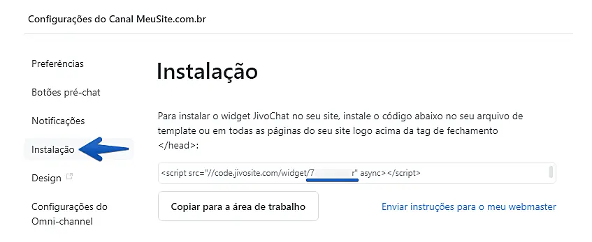 O código de instalação do Jivochat está disponível no aplicativo da JivoChat, na seção Instalação: Configurações -> Canais -> Configurações (abaixo do nome do canal do site) -> Instalação.