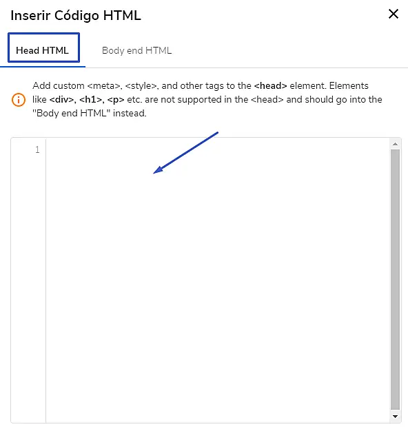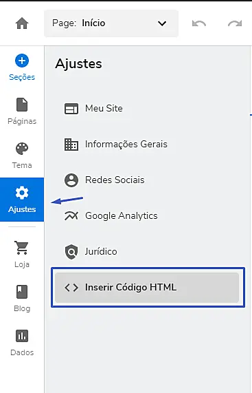 Primeiro, acesse o painel administrativo do seu site da Hostgator e, após abrir o menu no lado superior à esquerda, siga para: Ajustes -> Inserir Código HTML.