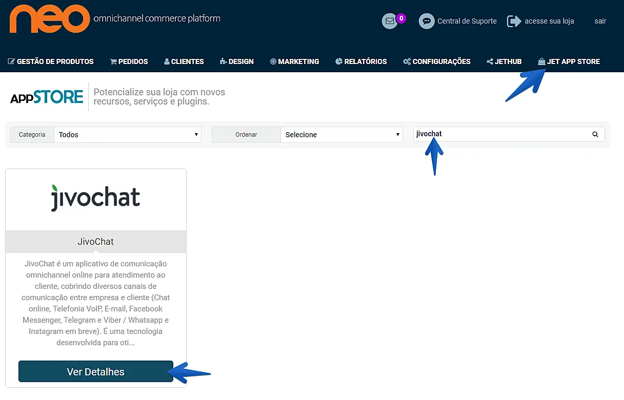 Primeiro, acesse o painel administrativo da Jet, clique em "JET APP STORE", pesquise pelo aplicativo "JivoChat" e clique em "Ver Detalhes".