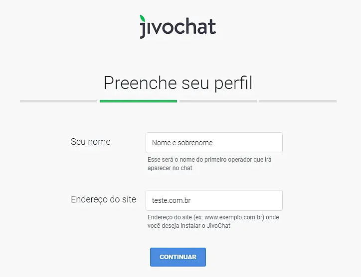 Na tela seguinte, insira seu nome e endereço do site. Caso o site ainda não esteja pronto, coloque um endereço provisório.