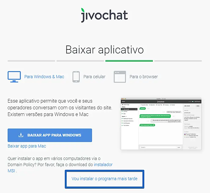 Na próxima etapa você pode já instalar o aplicativo do JivoChat no seu computador/celular, ou clicar para instalar mais tarde para continuar o processo de cadastro. Você pode baixar nossos aplicativos a qualquer momento pela nossa página de aplicativos.