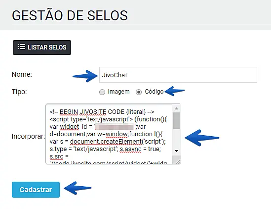 Insira um nome de idenficação para o selo, selecione o tipo "Código", cole o código de instalação do JivoChat no campo "Incorporar" e clique em "Cadastrar".