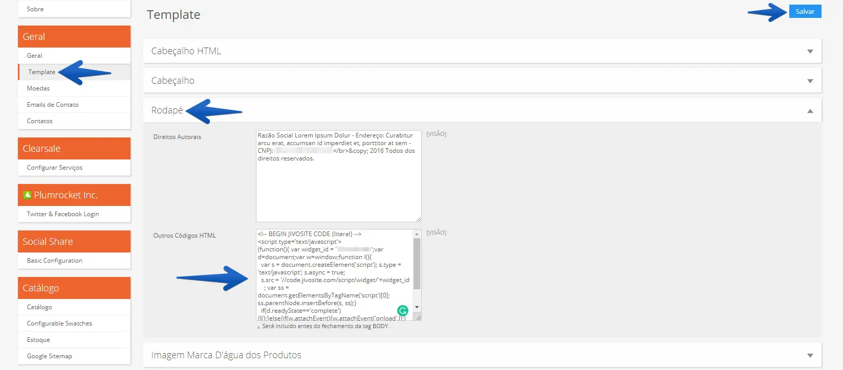 Primeiro, acesse o painel administrativo da JN2 e, no menu à esquerda, siga para: Template -> Rodapé -> Outros Códigos HTML -> Insira o código de instalação do JivoChat e clique em "Salvar" no canto direito superior.