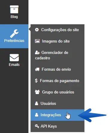 1. Acesse o painel administrativo da Live eCommerce e, no painel à esquerda, acesse o menu Preferências -> Integrações.