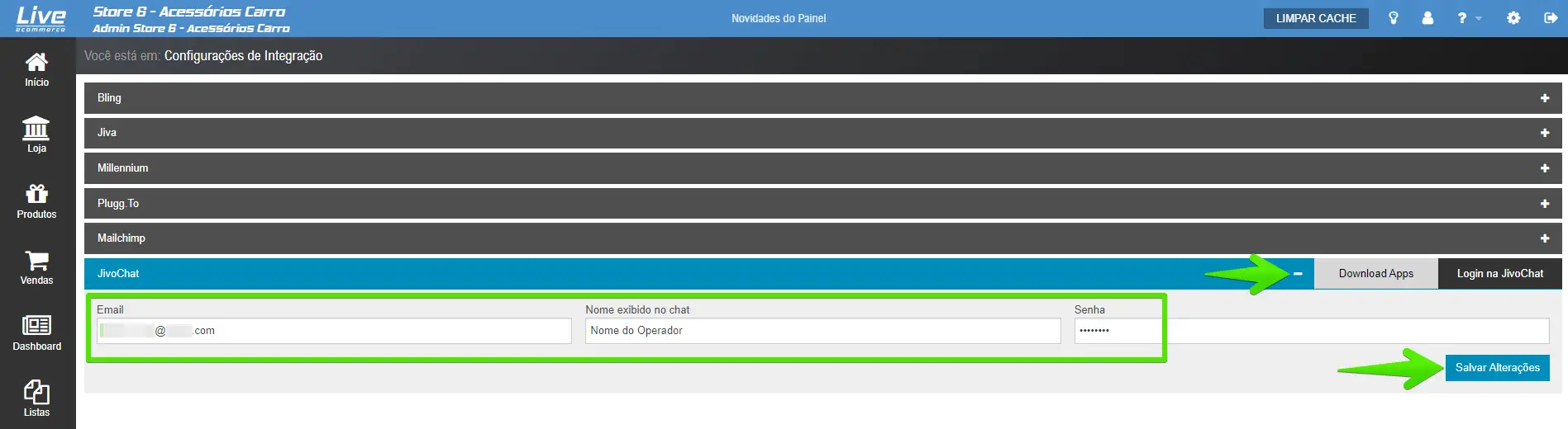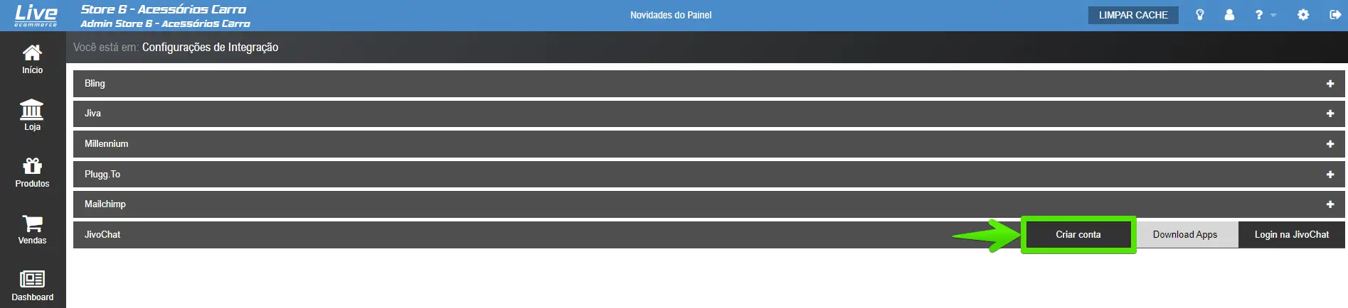Para instalar o JivoChat no seu site da plataforma Live eCommerce, basta seguir os passos abaixo: