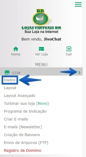 1. Acesse o painel administrativo da Lojas Virtuais BR e, no painel à esquerda, acesse o menu Loja -> Dados.