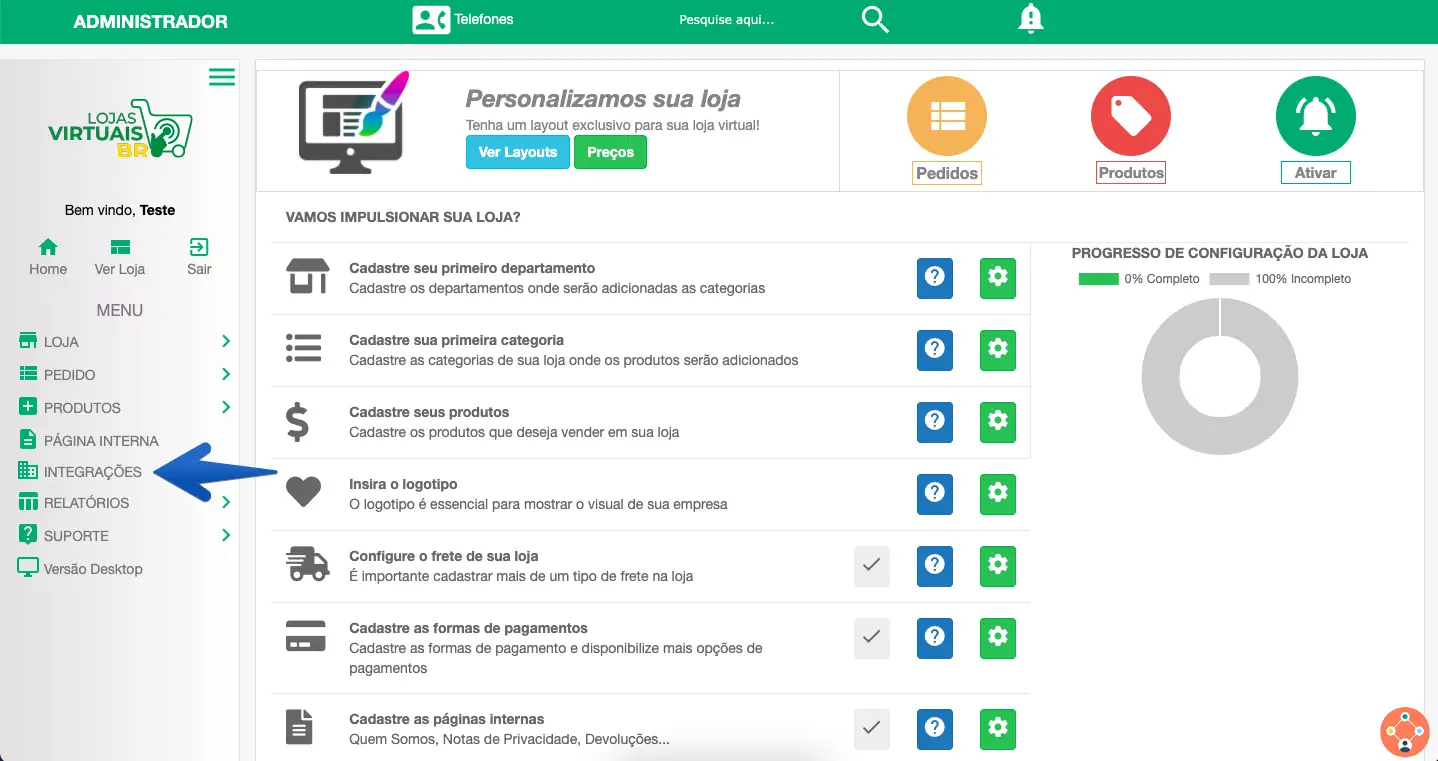 1. Acesse o painel administrativo da Lojas Virtuais BR e clique em Integrações.