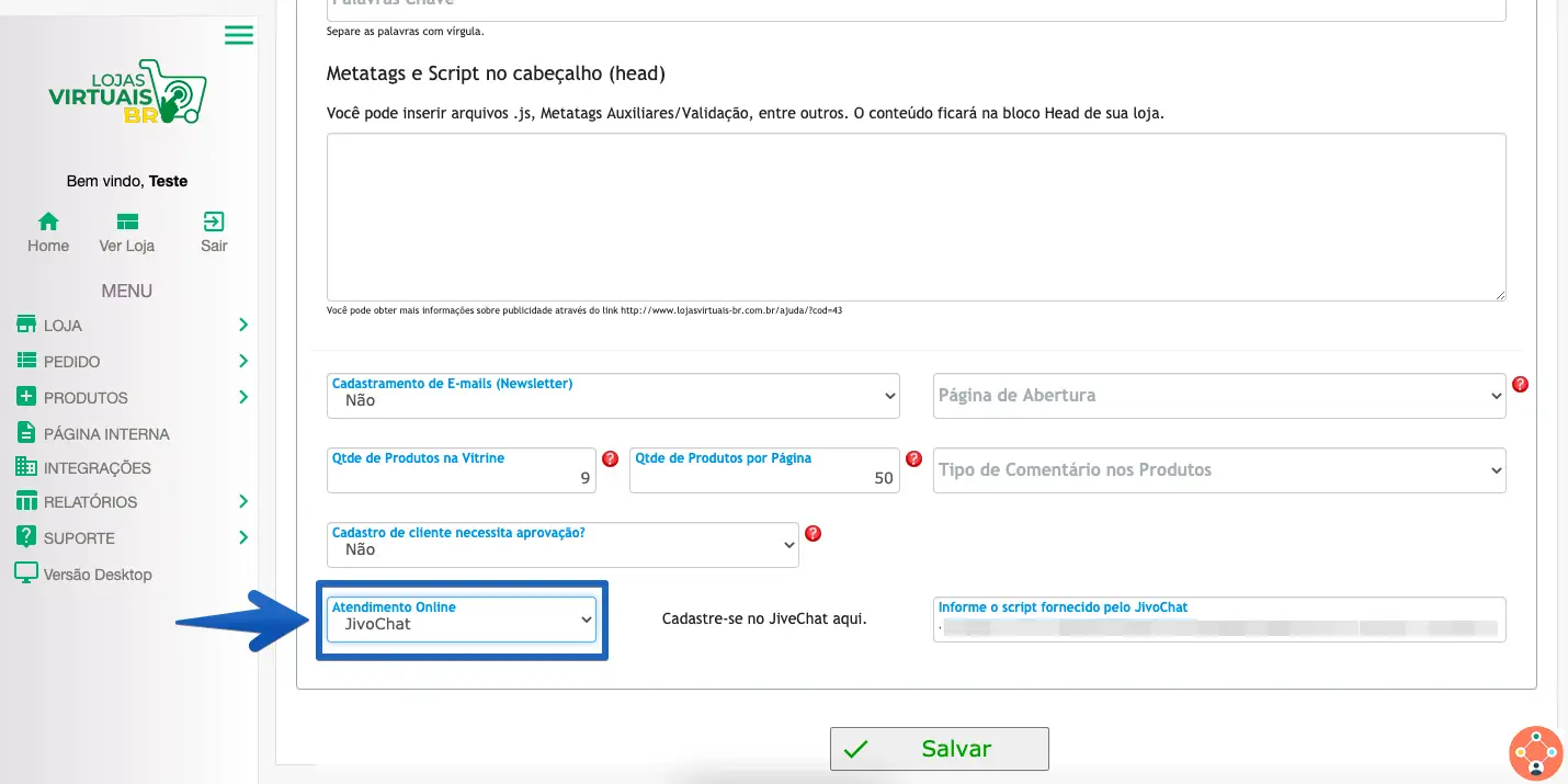 3. No campo Atendimento Online, selecione a opção JivoChat.