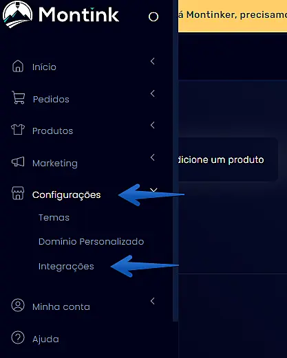 1º passo: Acesse o painel administrativo da Montink -> clique em Configurações -> Integrações