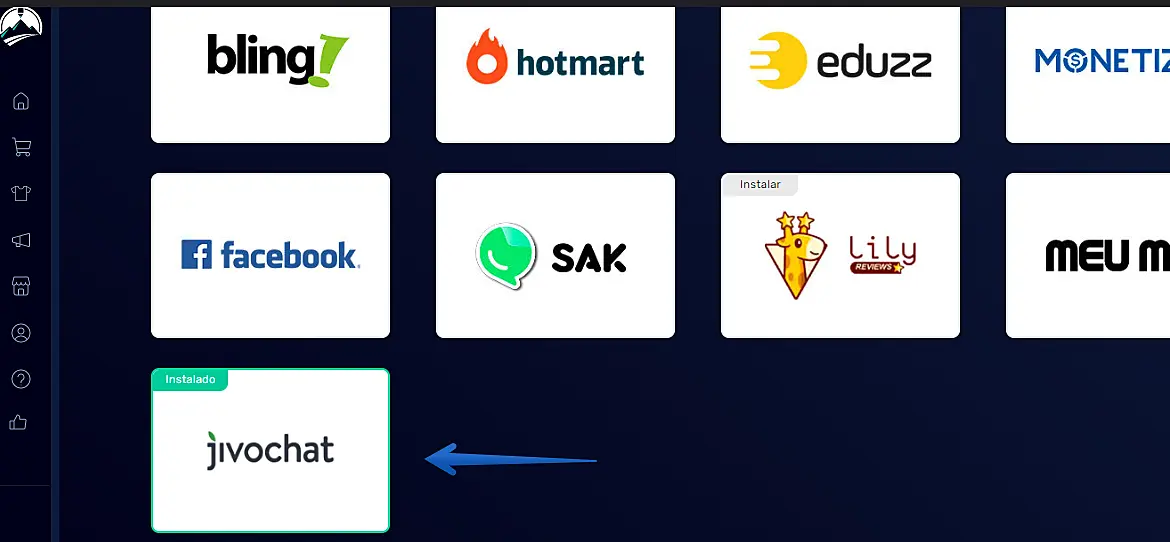 2º Passo: Ao abrir o painel com as ferramentas de integrações, clique em "JivoChat"