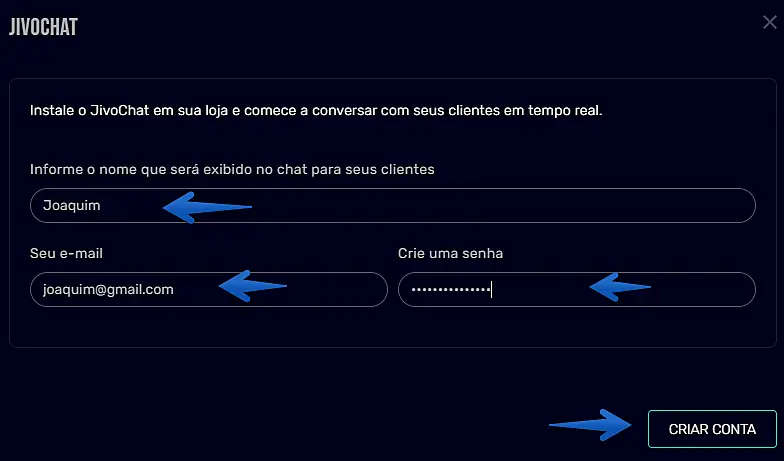 3º Passo: Na sequência, preencha os campos com o nome que será exibido no chat para seus clientes, seu e-mail da JivoChat e sua senha de acesso da sua conta da JivoChat.