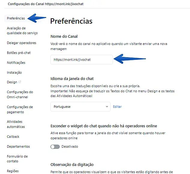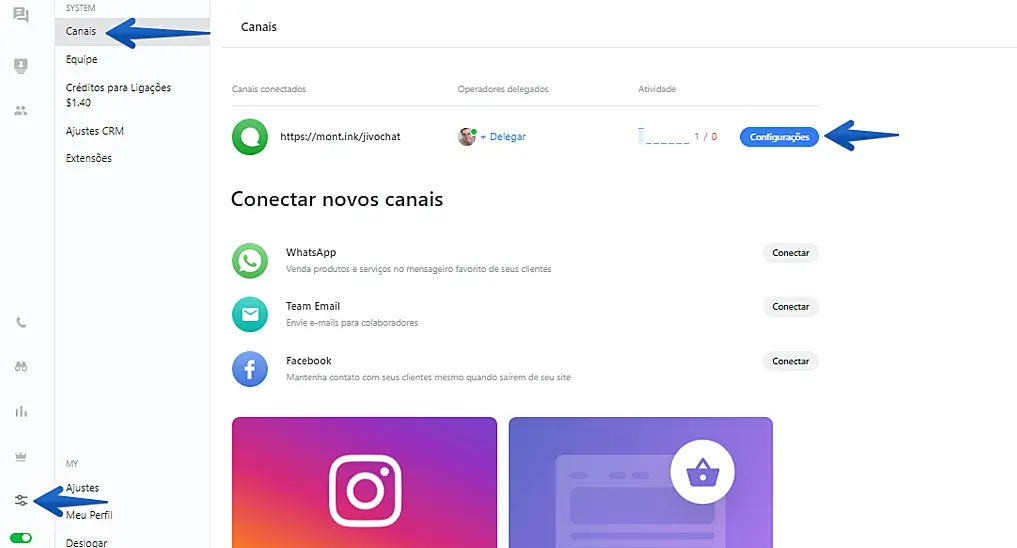 4º Passo: Após concluir a instalação na Montink, entre em sua conta da JivoChat, -> siga em configurações -> canais -> configurações do canal