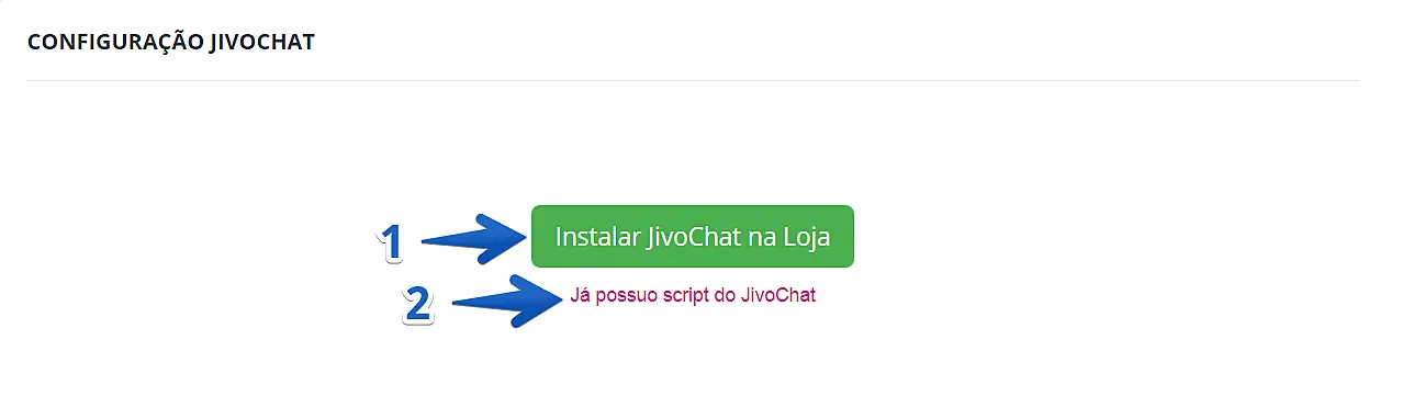 Se você já possui uma conta no JivoChat, clique em Já possuo script do JivoChat (2) e cole o código de instalação no campo de Código, como mostrado na imagem abaixo.