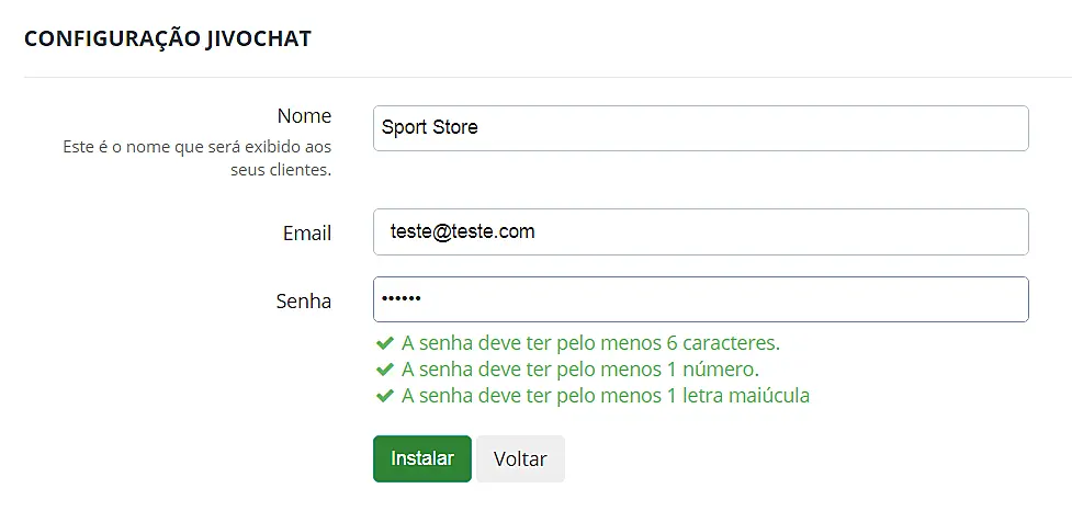 Caso não possua uma conta no JivoChat, clique em Instalar JivoChat na Loja (1).