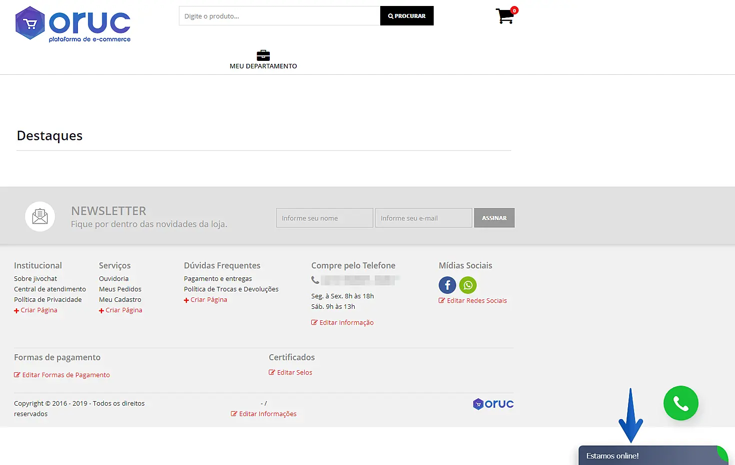 Para instalar o JivoChat no seu site da plataforma de e-commerce Oruc, basta seguir os passos abaixo: