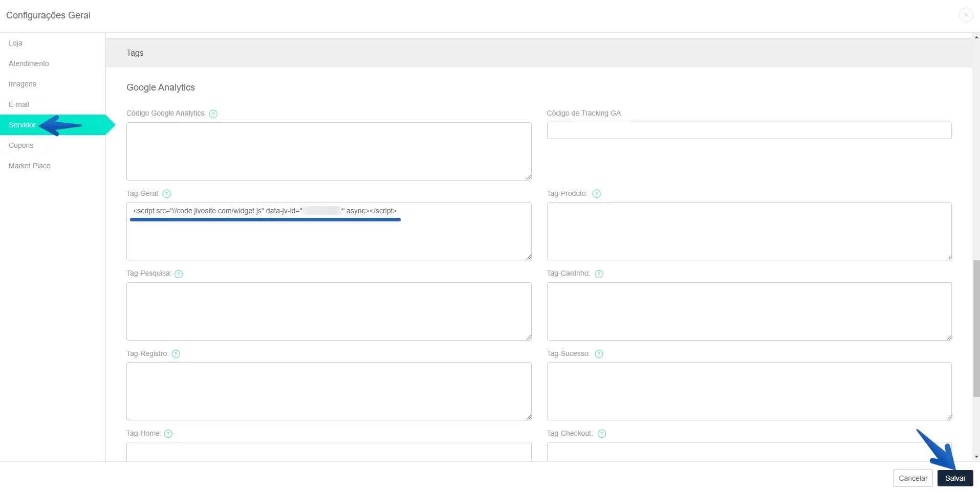Insira o código de instalação do JivoChat dentro de Servidor -> Tags -> Tag Geral. Depois, clique em Salvar.