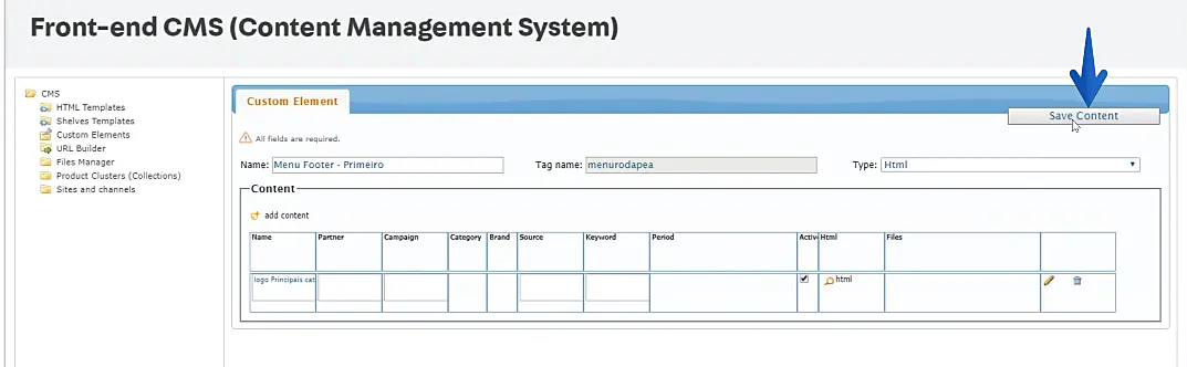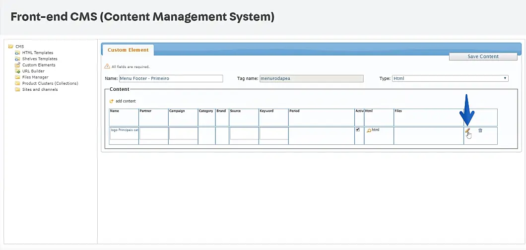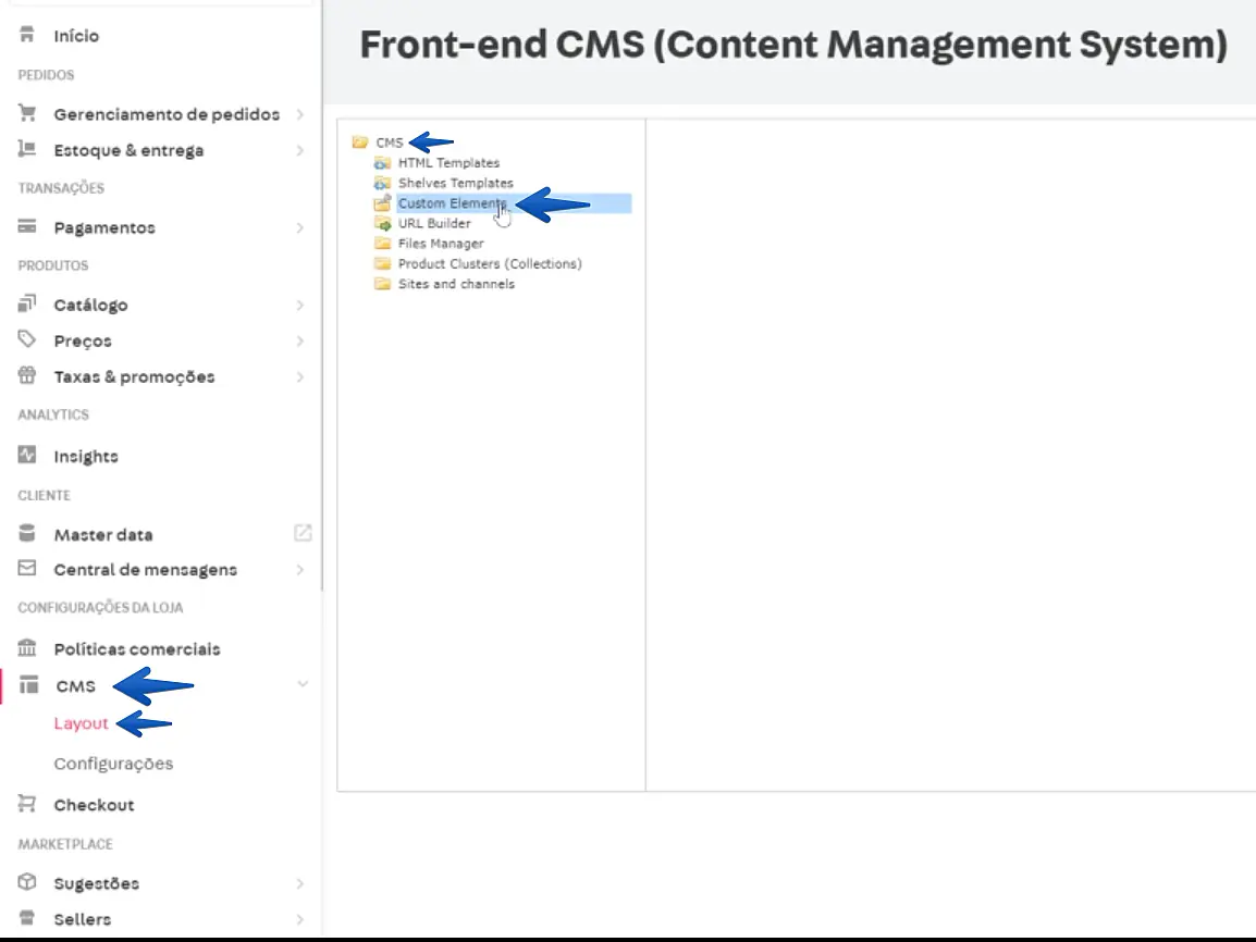 Primeiro, acesse o painel administrativo da Vtex e, no menu à esquerda, siga para: CMS -> Layout -> CMS -> Custom Elements.