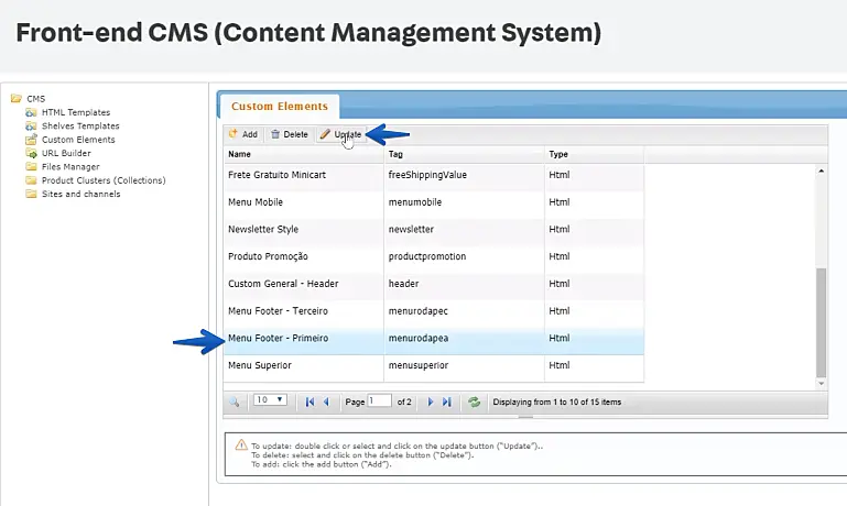 Desça até encontrar a opção "Menu Footer - Primeiro", ou somente "Menu Footer" caso não exista a divisão, clique em cima da linha para selecioná-la e depois clique em "Update".