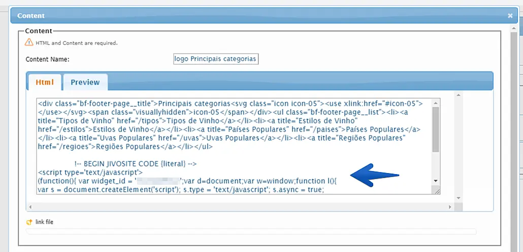 Role até o final do código que verá na tela, dê um Enter para pular uma linha e cole o código de instalação do JivoChat.