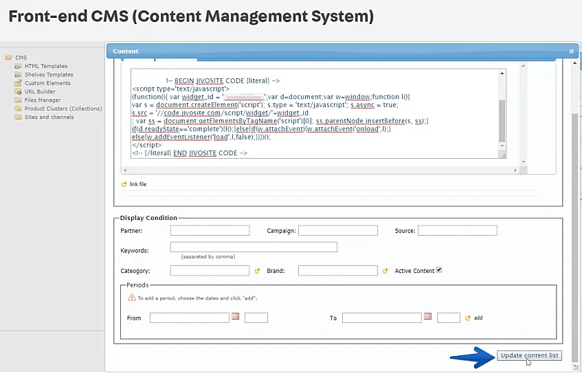 Após colar o código, clique em "Update content list".