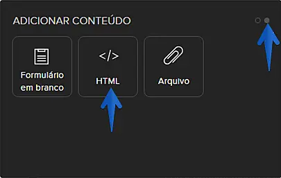 4.Em "Adicionar conteúdo", clique na bolinha para ver mais opções e selecione a opção HTML.