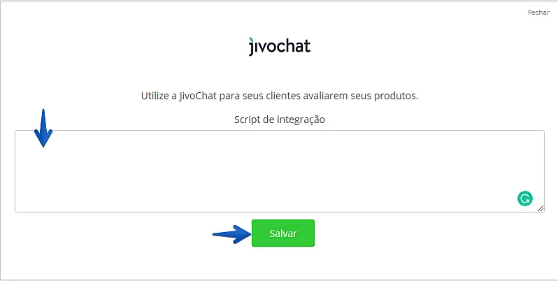6. Com o código em mãos, volte para o painel da Webstore, insira seu código no campo Script de integração e clique em Salvar.