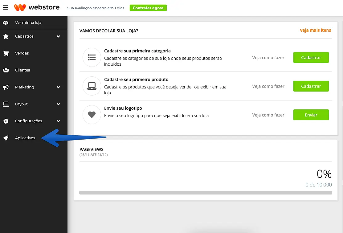 1. Acesse seu painel da Webstore e clique Aplicativos.