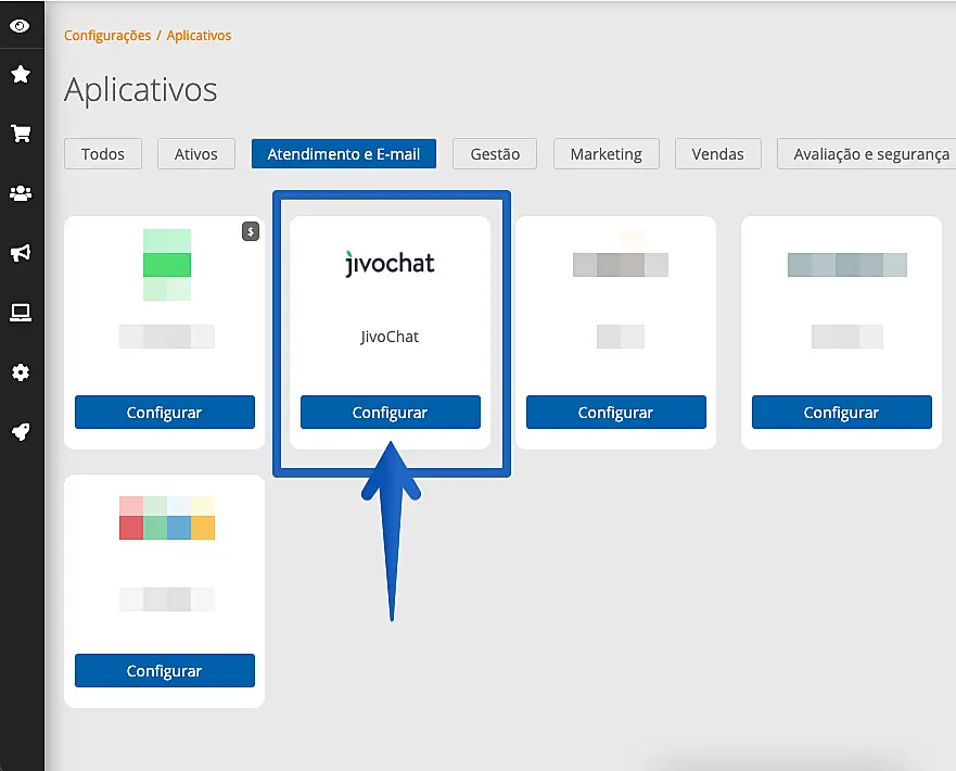 2. Clique na categoria Atendimento e E-mail, encontre o JivoChat e clique em Configurar.