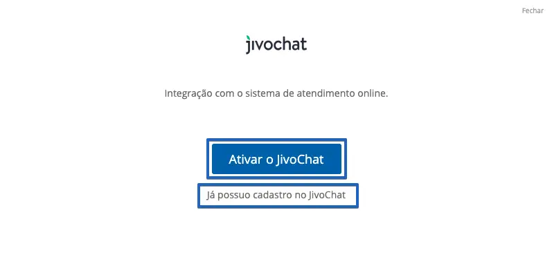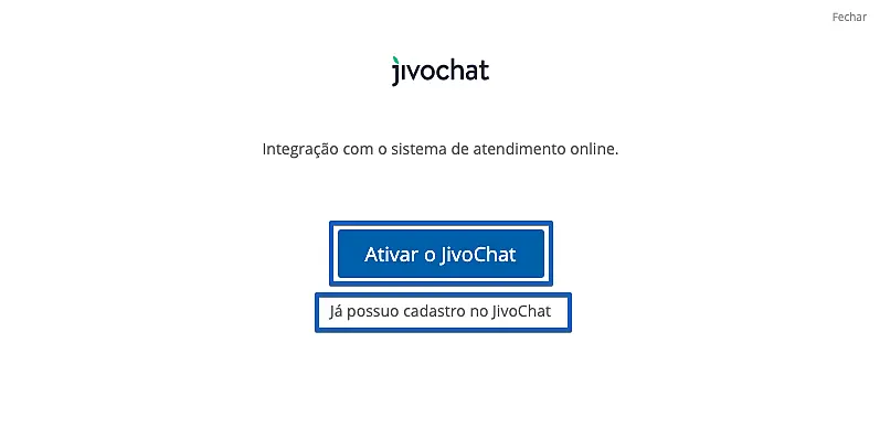 3. Caso ainda não possua uma conta no JivoChat, clique aqui para criar sua conta, em seguida, retorne ao painel da Webstore e clique em Ativar o JivoChat. Caso você já tenha uma conta no JivoChat, é só clicar em Já possuo cadastro no JivoChat.