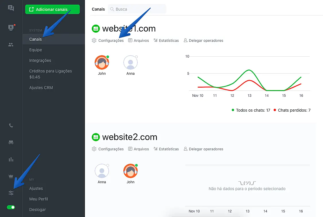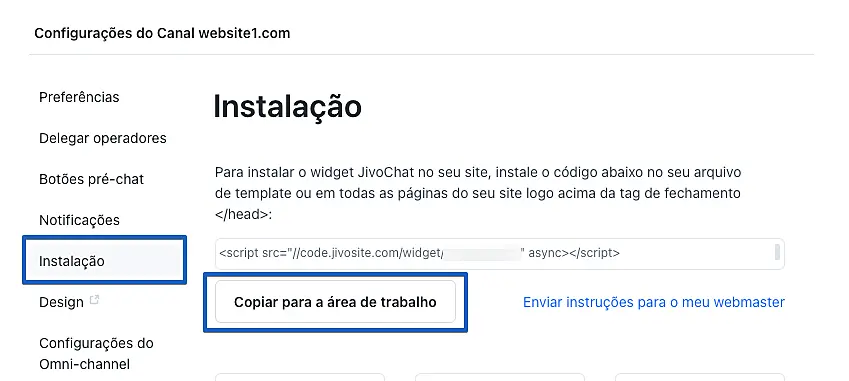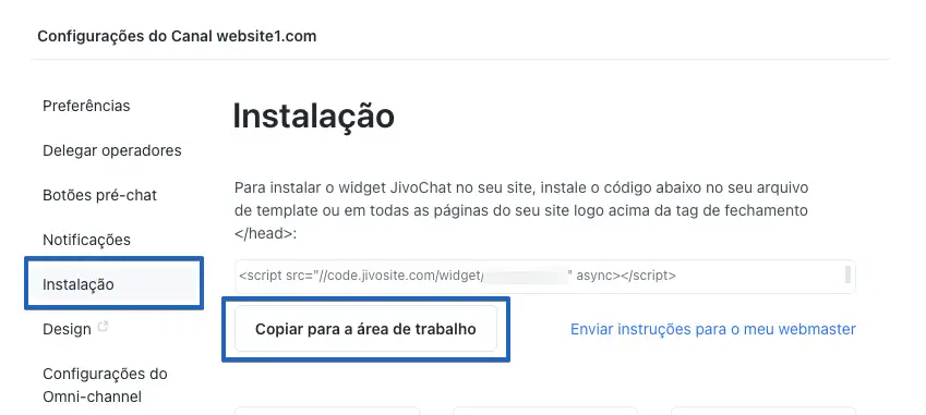 4. Para finalizar a instalação você precisa do código de instalação do JivoChat. Para encontrar essa informação, acesse o aplicativo do JivoChat para desktop ou o web app aqui, clique em Configurações → Canais → Configurações (abaixo do nome do seu site).