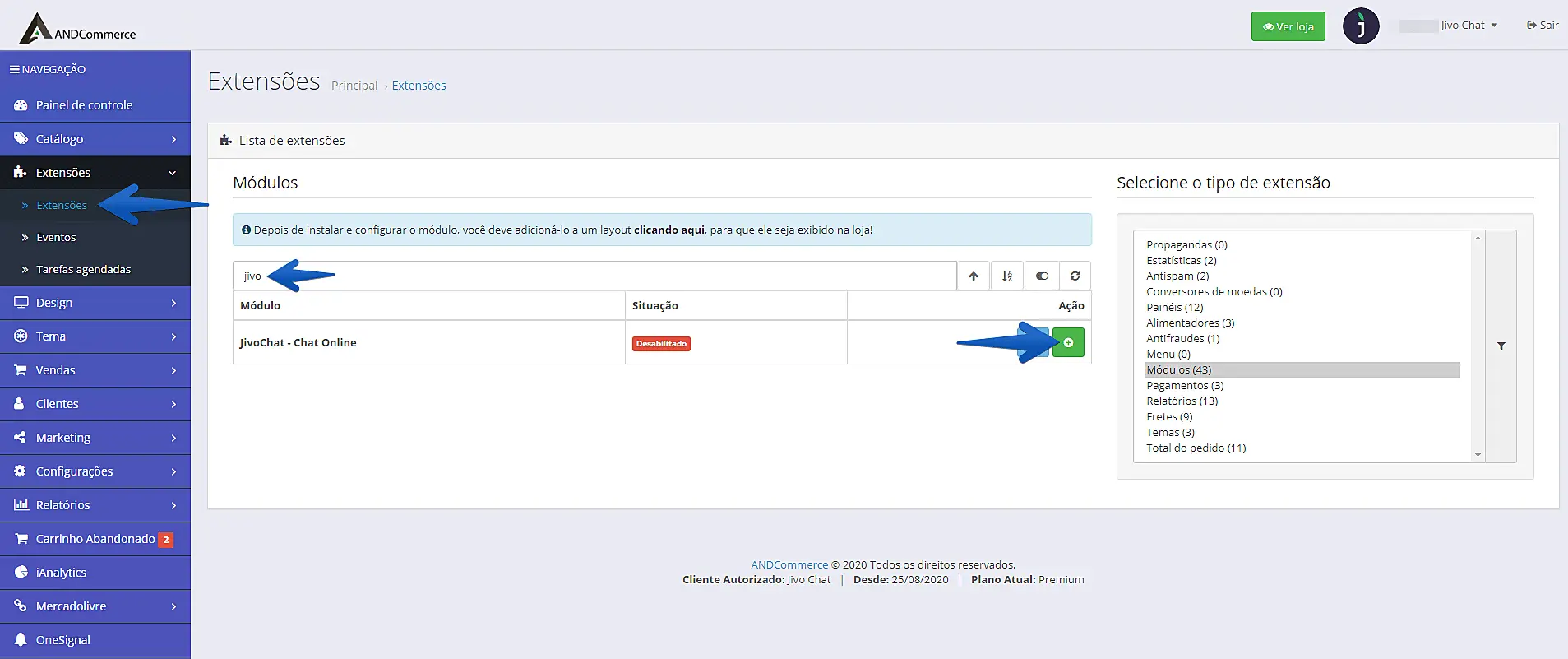 1. Acesse o painel administrativo do ANDCommerce e siga até Extensões -> Extensões -> Pesquise por JivoChat no campo de busca -> Instalar (botão verde).