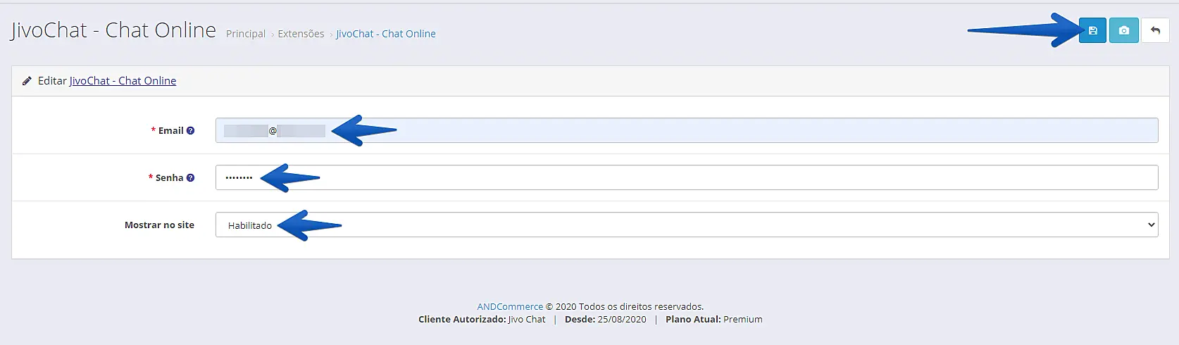 3. Caso já possua uma conta no JivoChat, insira seus dados de cadastro. Se ainda não possui uma conta no JivoChat, insira um e-mail e senha para criar uma nova conta. Marque a opção de "Mostrar no site" como Habilitado e clique em Salvar no canto direito superior para finalizar a instalação.
