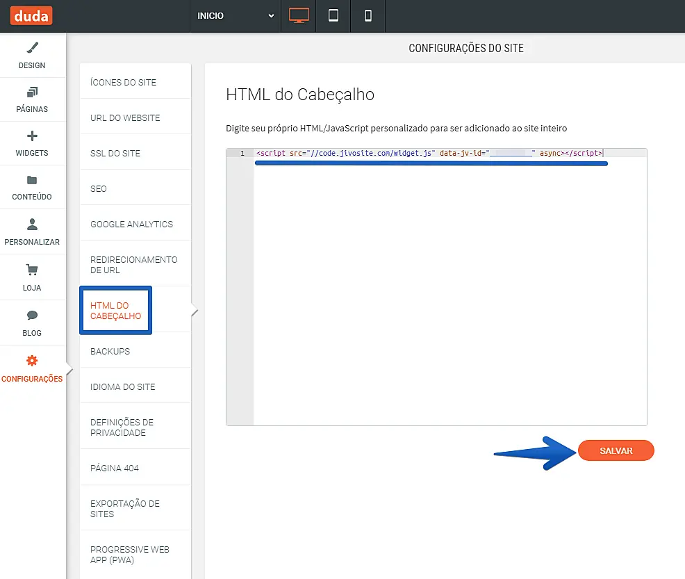 Para instalar o JivoChat no seu site da plataforma de e-commerce Duda, basta seguir os passos abaixo: