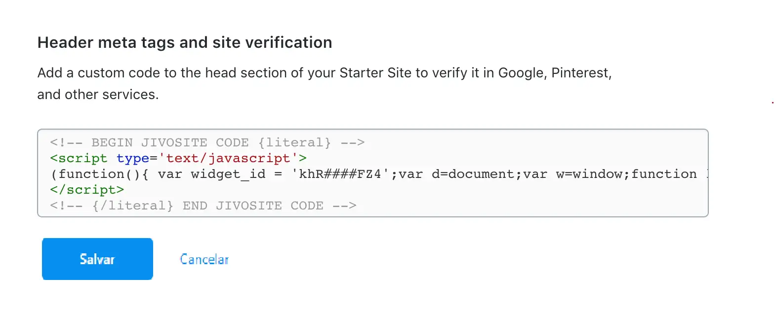 2. Insira o código de instalação do JivoChat no campo de meta tags do Header (Cabeçalho).